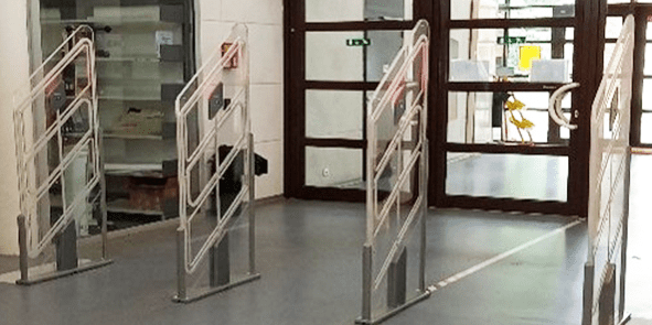 Système antivol électromagnétique, design plexiglas-inox, détection 3D – idéal bibliothèques, espaces culture – protection haute performance.